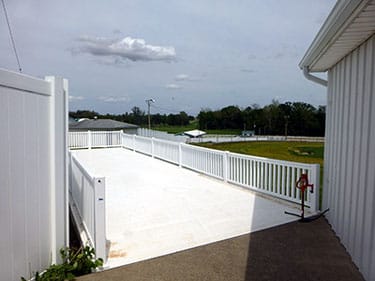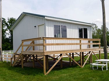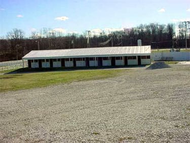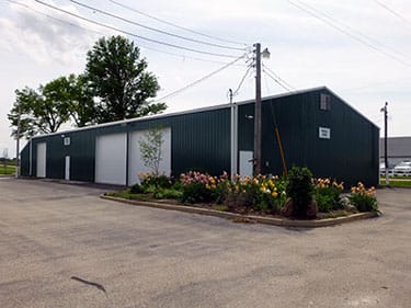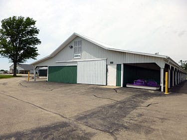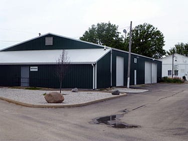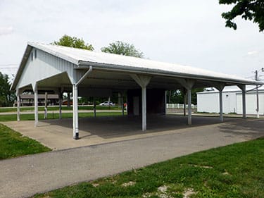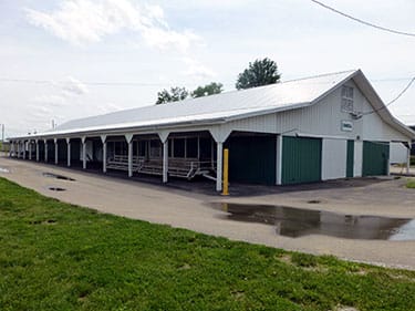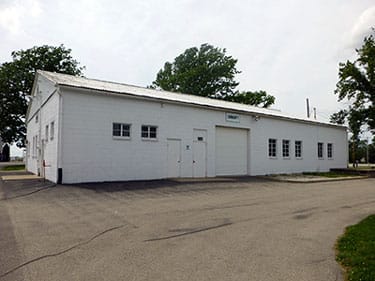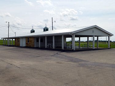 This is a free span, building with a concrete floor, metal walls, and 16′ high ceilings. Restroom facilities, tables and chairs, are included with the building rental.