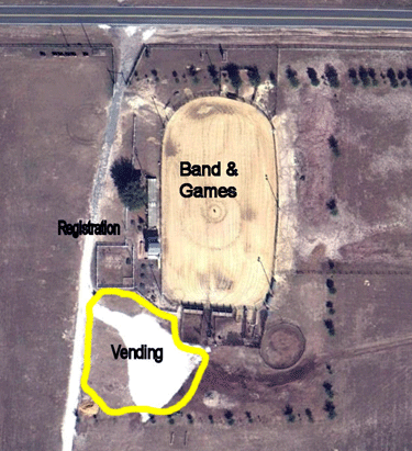 The horse arena near the top center of the picture is used regularly for Gymkhana (Barrel Racing, Pole Bending, etc) events, calf roping, and bull riding. There is a concession stand, 2 bathrooms and 2 showers with hot water. Port-A-Pots will be in the field. Pasture Showers with LP “Instant On” hot water also available.