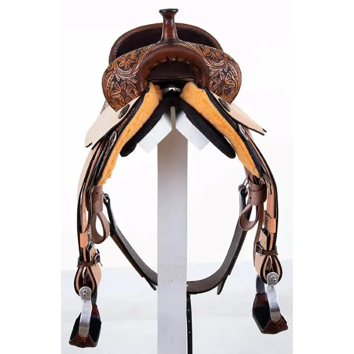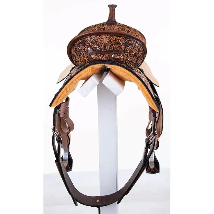 The MJ50 Josey Cash Rancher has the tree riders love with a taller, 9” swell and 5” cantle, providing an extra secure seat to keep the rider in the correct position. Beautiful floral tooling pops in a vintage finish and pencil roll cantle lend a punchy ranch look. The chocolate suede seat and contrasting rough out fenders provide style and grip for a secure seat in tight turns. Rear cinch set included. Weight 30.00 Pounds