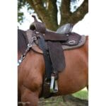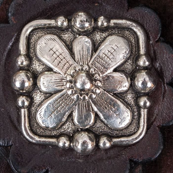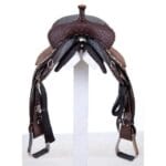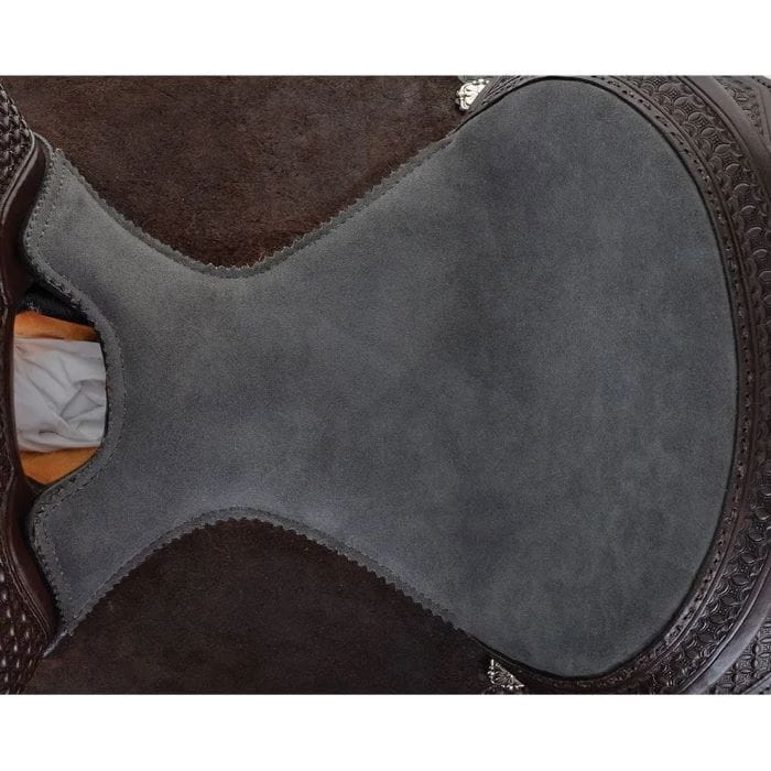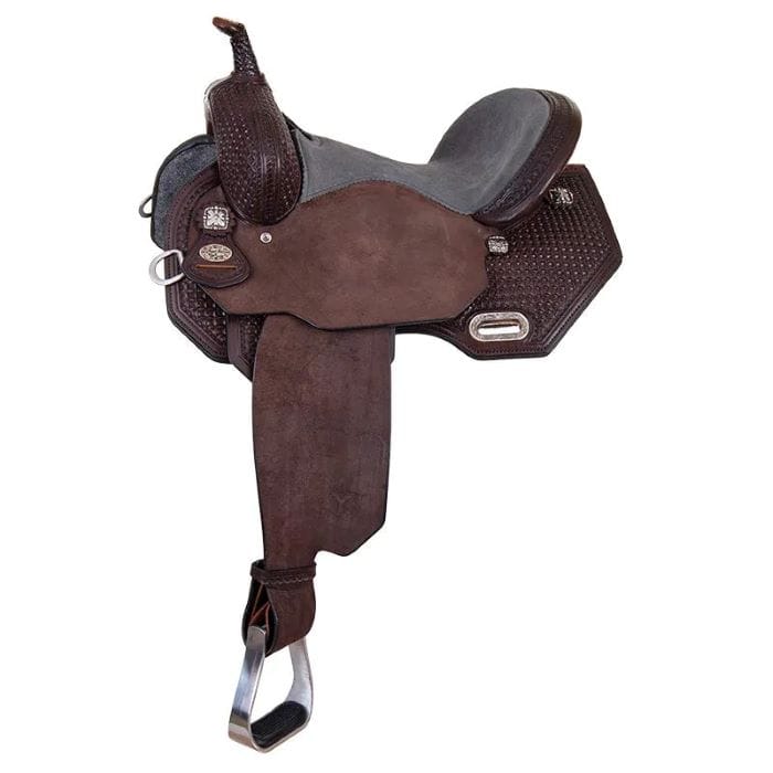 Grey suede and roughout fenders and seat jockeys look great and provide grip on this chocolate saddle from Sarah Rose. The 1401 Sarah Rose Prairie Rose has a Flex2 design that provides comfort and freedom for the horse in a lightweight saddle. A balanced seat helps you ride effectively and a close contact skirt and low profile fit keep you close to your horse when you need precise cues. The Grip-Rite skirt liner does not pack down or pick up debris and helps keep your saddle in place for tight corners. The Rider Locking stirrup leather buckle prevents the sleeve from sliding off and losing a stirrup. “I love this saddle! I feel like I”m sitting around and with my horse and not on top of my horse which means better riding.” Sarah Rose Saddle comes with a nylon off billet (1 3/4″ x 36″) and a nylon tie strap (1 3/4″ x 70″). Weight 24.00 Pounds Cantle Height 4.50 inches Horn 3 1/2″ Neck x 2″ Cap Swell 13 1/2 inches Seat Color Grey Suede Seat Size 13″, 13 1/2″, 14″, 14 1/2″, 15″, 16″ Color Chocolate Tooling Degree 1/2 Tooling Tooling Type Geo Flower Rigging 7/8 In-Skirt C Hardware Rockin’ Out Square Wildfire Tree Type Sarah Rose Flex2® Barrel Tree Fit Regular, Wide Skirt Drop 14.00 inches Skirt Length 24.00 inches Weight 24.0000