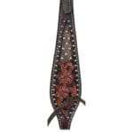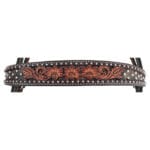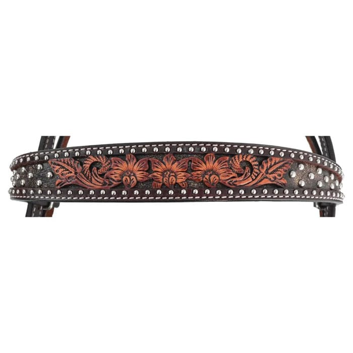he Dark Flash Arizona Flower tack is perfect for any occasion, with distressed leather that matches almost any saddle and bright silver spot accents on a dark textured underlay. The browband headstall has standard cheeks for your horse’s comfort and tie ends for easy and secure bit changes.
