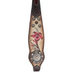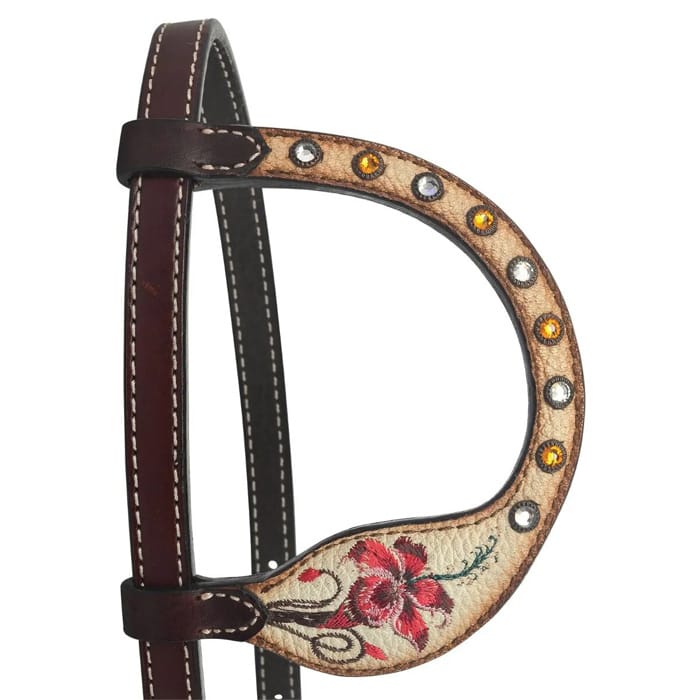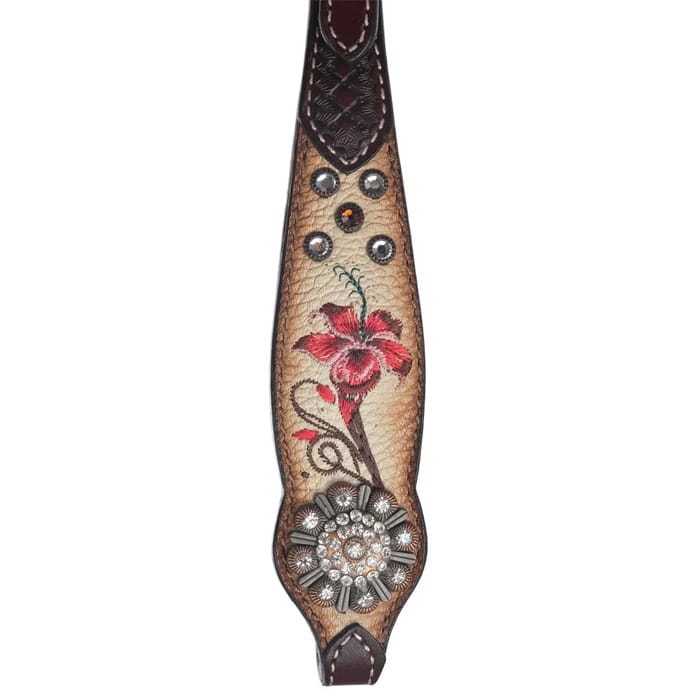 The Fire Lily Tack has contoured chestnut leather with a textured antiqued white faux exotic leather overlay with browned edges. Features beautiful Fire Lily embroidery, crystal encrusted berry conchos and amber and crystal spot accents.