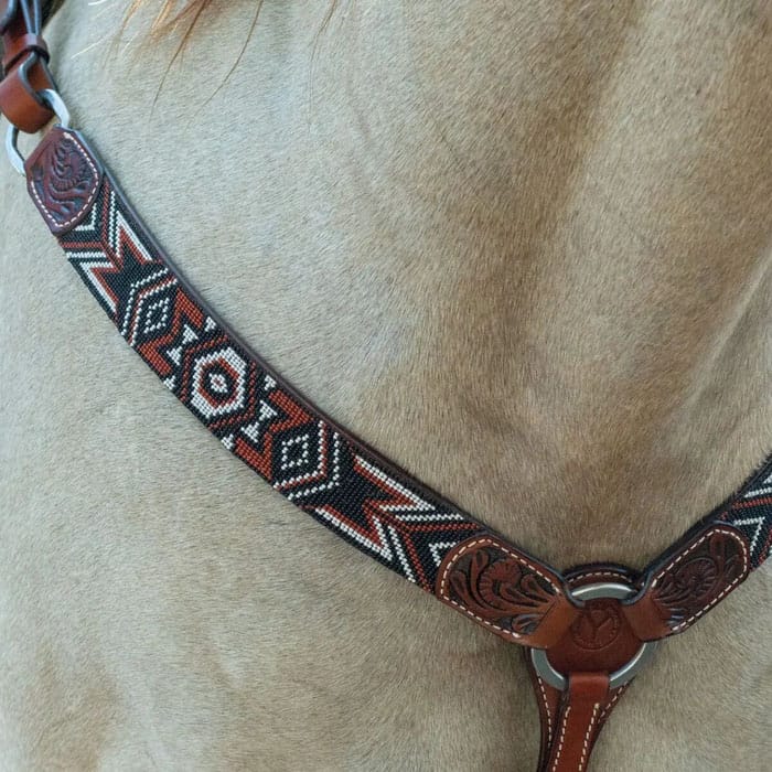 This detailed breast collar looks great on any coat color! With a wide band of infinity beading in a variety of colors and rich leather that matches any tack.