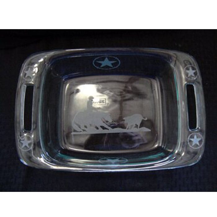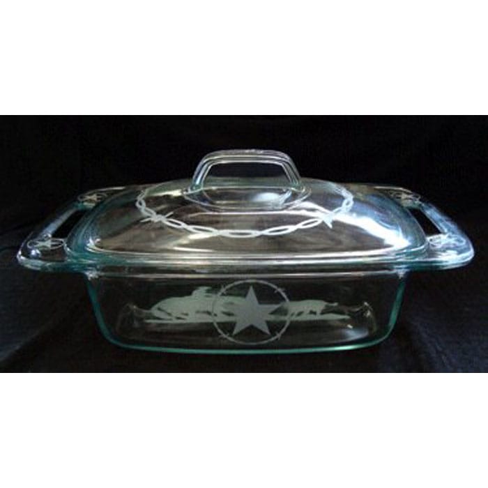 M.C. Diamond Ranch Western Decor Exclusive We offer a variety of individually etched glassware. The multi-stage technique is used to advantage on this sand-etched Casserole. Each etched design is wrapped around the Casserole to give a total design around. Add this for a stunning addition to your Western Dinnerware. Pyrex Easy Grab 2 quart casserole with glass cover. Customized with your Name, Monogrammed Initials or Custom Logo Designs, and Corporate Business Logos.