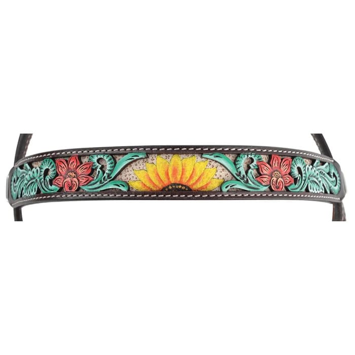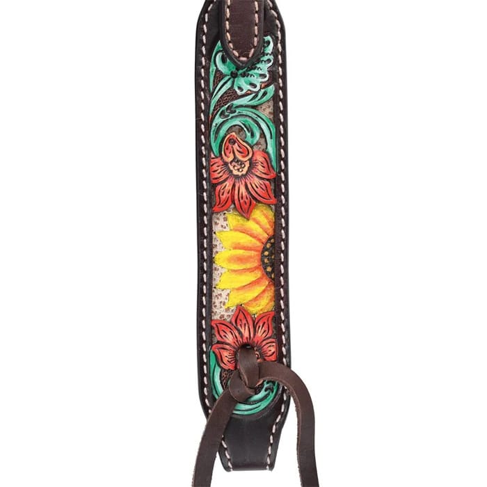 The custom designed Circle Y Rising Sunflower Browband Headstall has hand painted sunflowers over a cream colored leather underlay. These beautiful sunflowers are paired with a vibrantly painted hand carved cactus flower filigree overlay. Both cheeks allow for adjustment allowing for a minimum length of 36″ and a maximum length of 43″. Made with standard leather lace bit ends.
