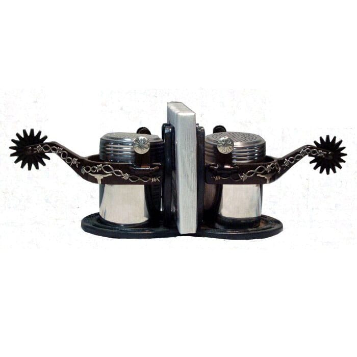 Add a little “Western Look” with this Spur Salt & Pepper shaker. The Barbwire Longhorn spurs with the napkin holder will add the unique look you are looking for. It will also make a great gift for your friends