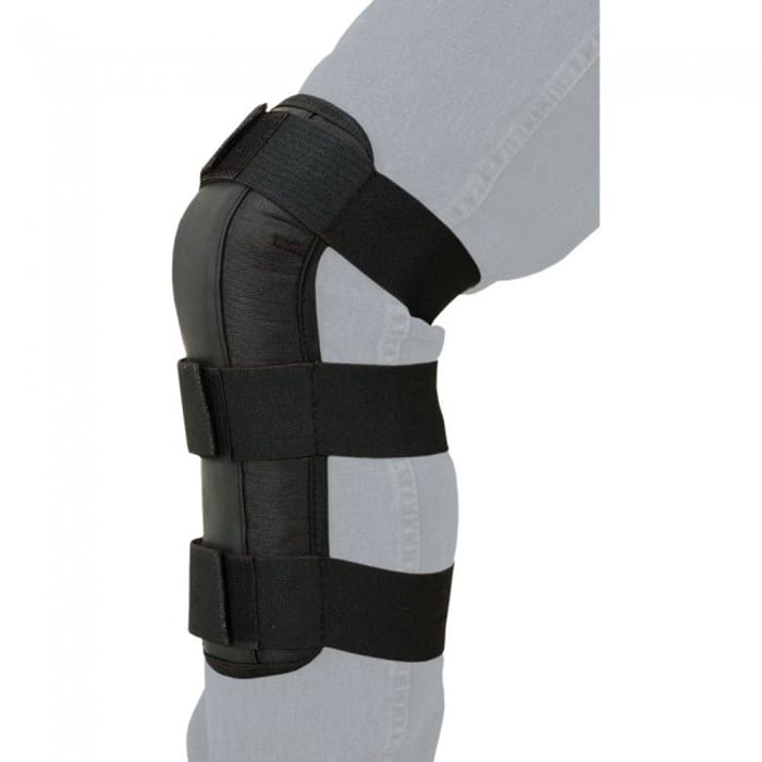A must-have for any barrel racer! No more bruised or sore shins from hard knocks with these padded neoprene guards with reinforced rubber strips for extra protection. Use the three elastic ?Quick Grip? straps to comfortably secure guards in place. Sold as a pair. 13″ Tall