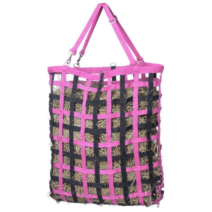 The most popular hay bag style! This feeder is made with non-stretch 2” openings to slow down your horse’s munching and reduce hay waste. Top features a plastic frame to make loading hay easier. The two adjustable hanging straps include easy-to-use snap ends to close the top of the bag. Complete with a lower strap to keep feeder from spinning during use. Colors Black, Navy Blue, Royal Blue, Turquoise, Teal, Hunter Green, Purple, Pink, Red, Light Blue and Light and Dark Grey.
