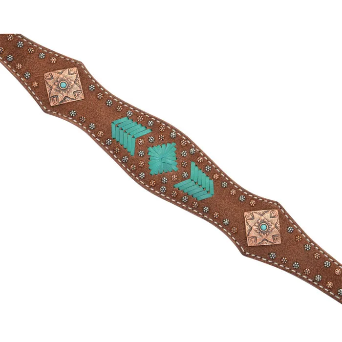 This set offers the perfect combination of the traditional cowboy look and modern flair. Featuring roughout leather, turquoise lacing, and vintage copper and turquoise conchos that look great with any tack on any coat color.